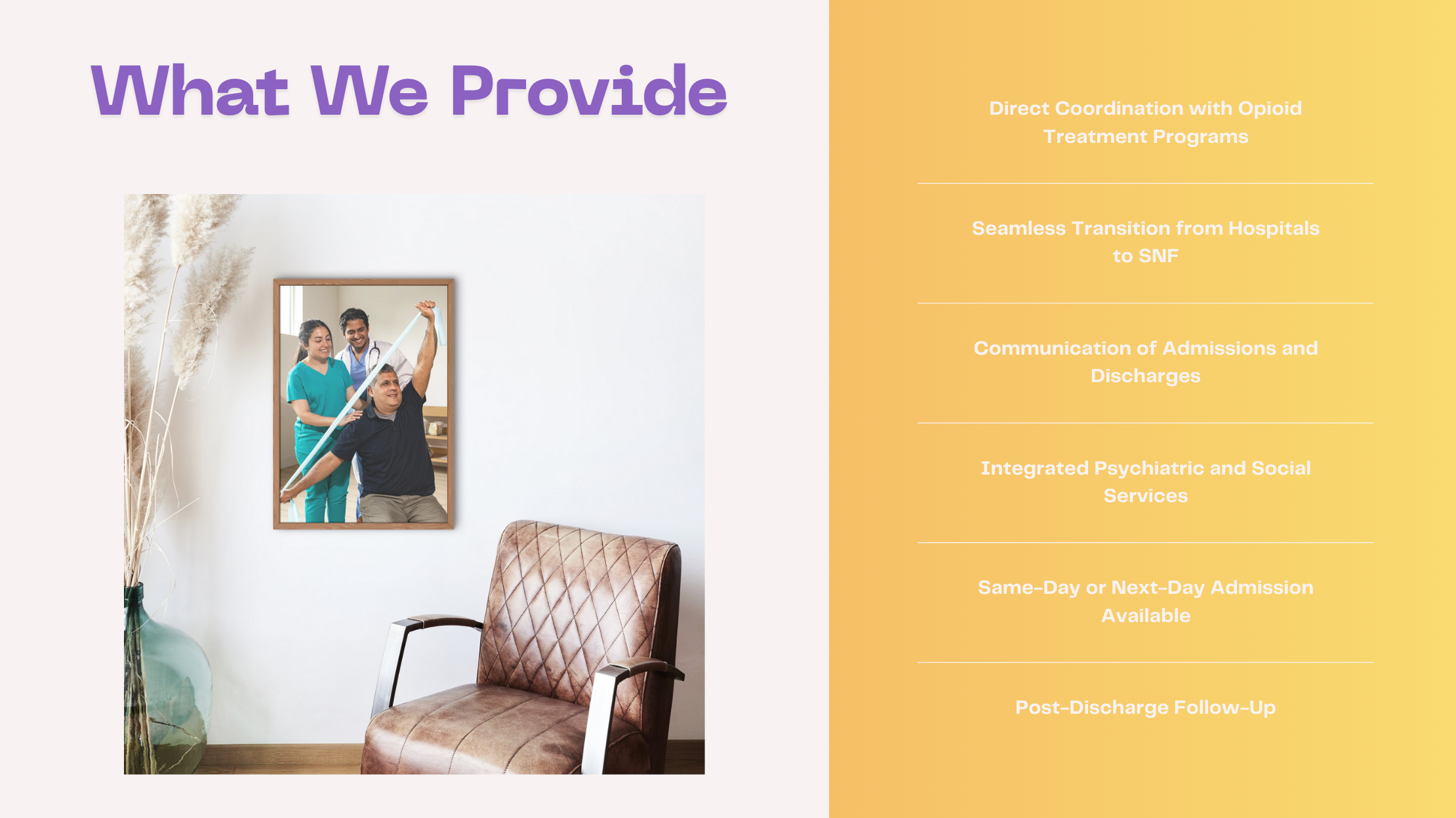 Together, we work to streamline communication, support continuity of care, and promote recovery at every stage of the transition from hospital to skilled nursing.